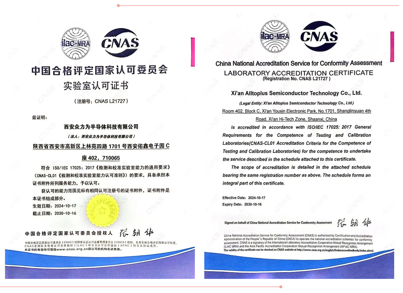 近日,西安众力为半导体科技有限公司经过严格文审及现场审核,成功通过中国合格评定国家认可委员会(CNAS)的权威认可,获得CNAS证书(ISO/IEC17025:2017),一举跻身国家认可实验室行列。